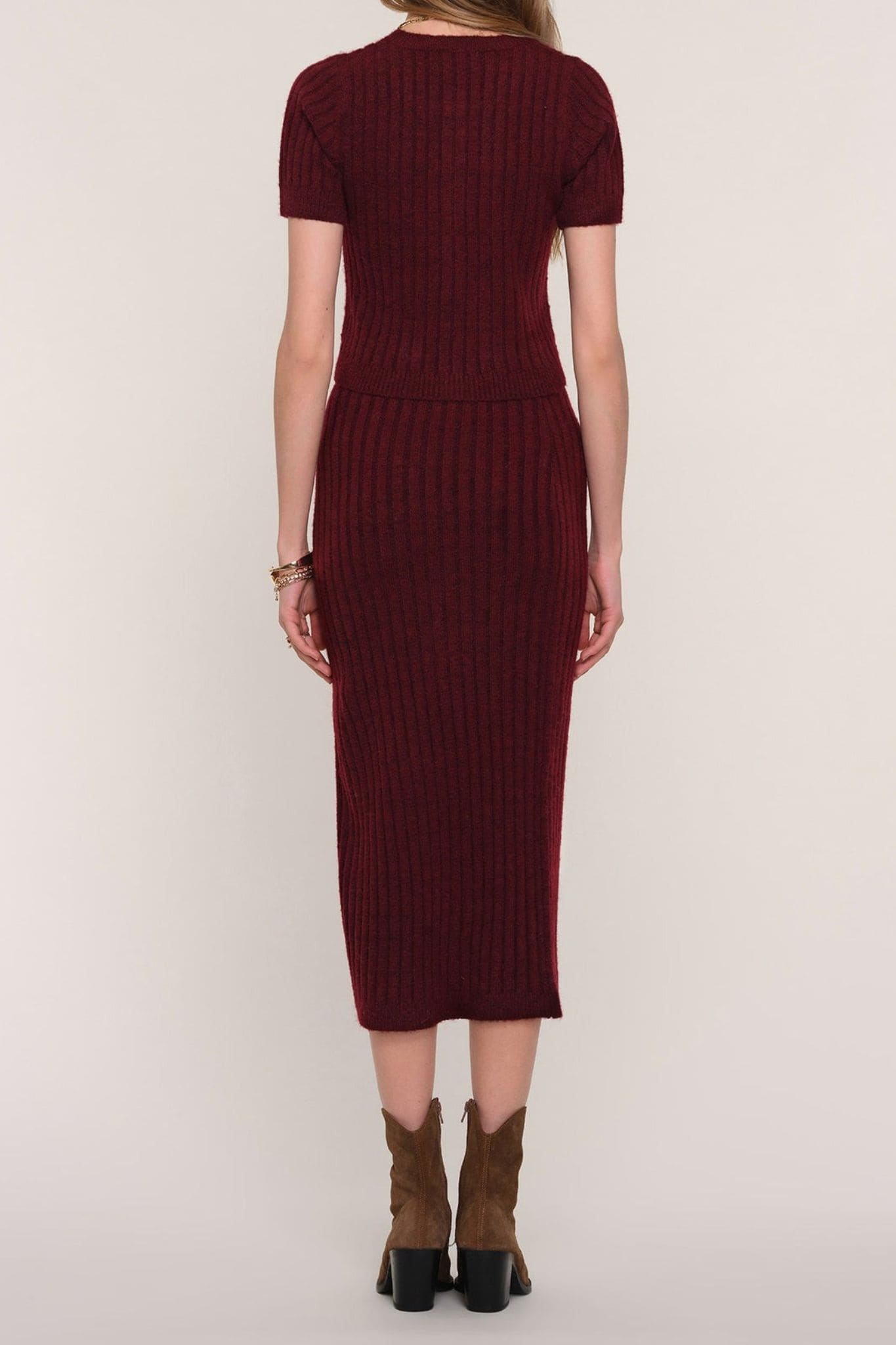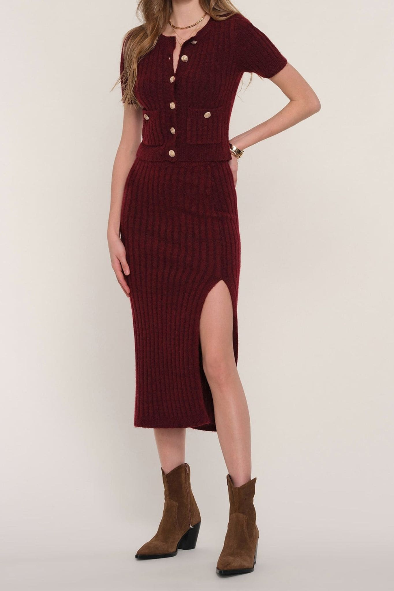 Design & Details: Includes a short-sleeve knit cardigan with novelty buttons and a slim-fit midi skirt.